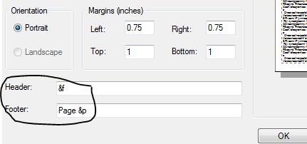 - Replace the text written in the "Header” and "Footer” box (as shown above) by any of the following codes: